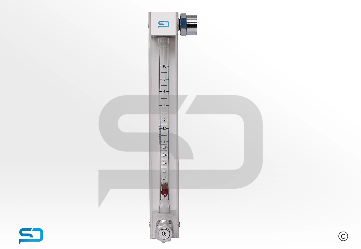 Oxygen tube flow meter with rotary float and large scale, which is magnified view at the touch with scale reading from 0.1-4 LPM, 6 LPM, 10 LPM.